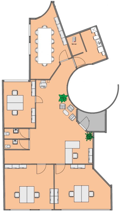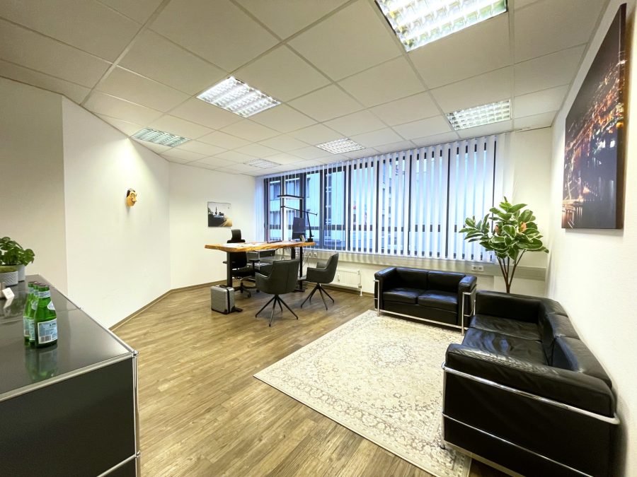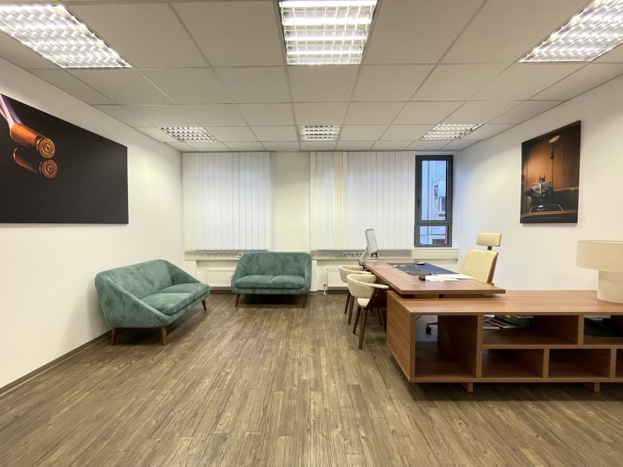 Die Bürofläche ist geschickt aufgeteilt und umfasst neben einem Empfangsbereich separate Toiletten, eine Teeküche, einen Besprechungsraum sowie drei weitere Büroräume.