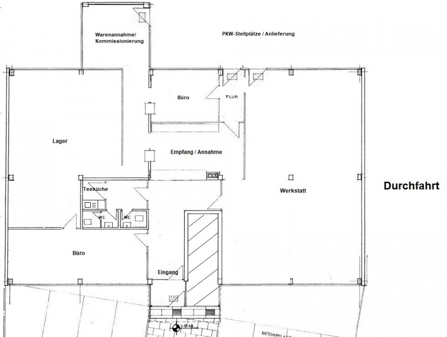 Neben der Gewerbefläche stehen im Außenbereich ausreichend Stellplätze und bei Bedarf eine zusätzlich anmietbare Garage als Lager zur Verfügung. Beim ausgewiesenen Mietzins wird die Fläche im gegenwärtigen Zustand besenrein und geräumt übergeben. Umbauten sind durch den Vermieter möglich, können individuell abgestimmt werden und führen zu einer Neukalkulation der Miete.