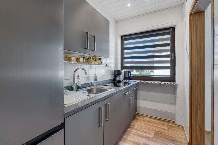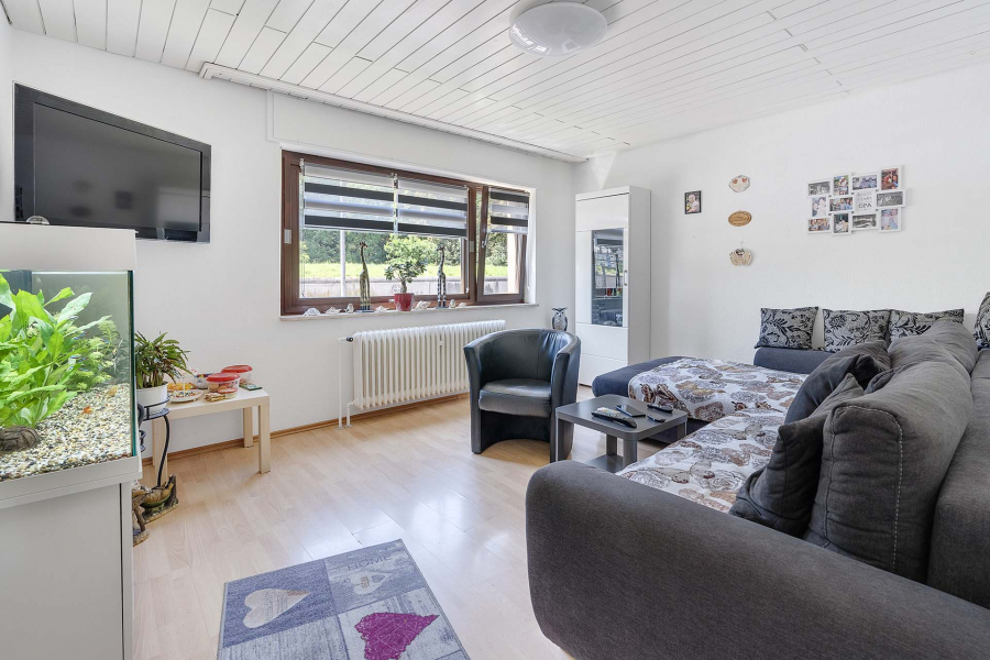 Die Wohnung im Erdgeschoss lässt keine Wünsche offen. Ein gemütliches Wohnzimmer, ein geräumiges Schlafzimmer, ein Bad und ein Esszimmer mit angrenzender Kochküche bieten Platz für zwei Personen. Ein überdachter Balkon mit Blick ins Grüne lässt den Tag im Sommer entspannt enden.