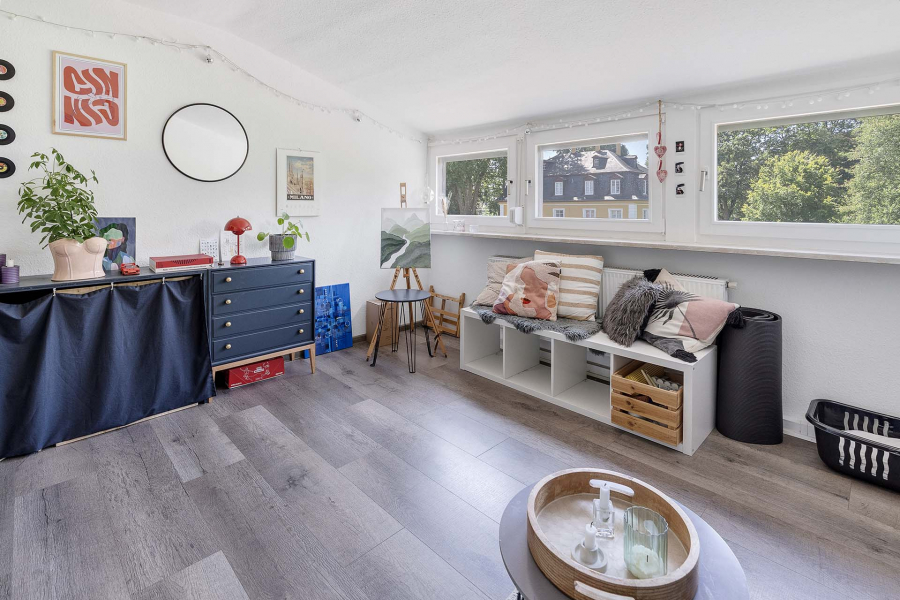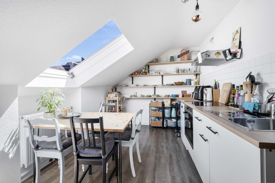 Die Wohneinheit im Dachgeschoss überzeugt mit gemütlichen Dachschrägen und Gauben. In der Küche ist Platz für einen Esstisch. Hier kann man gut in geselliger Runde kochen und anschließend das Essen genießen. Das Wohnzimmer lässt sich gemütlich einrichten und das Schlafzimmer ist praktisch und gut. Das moderne Duschbad rundet das Raumangebot ab.