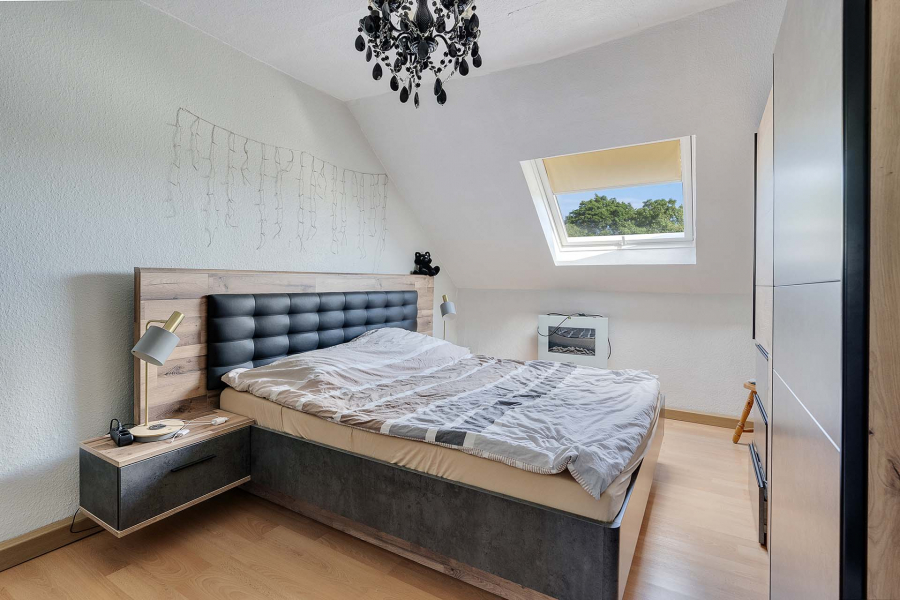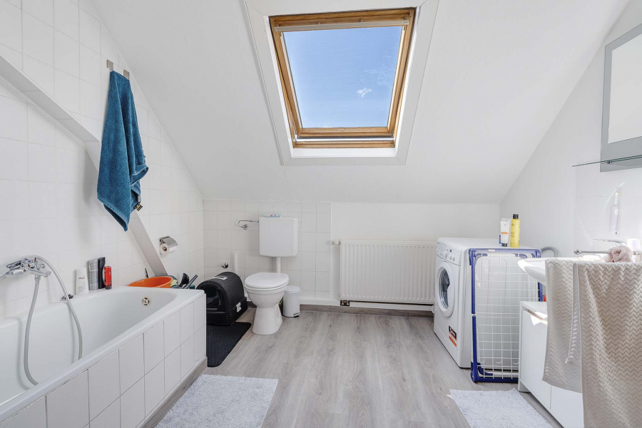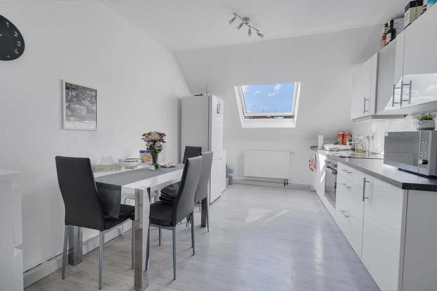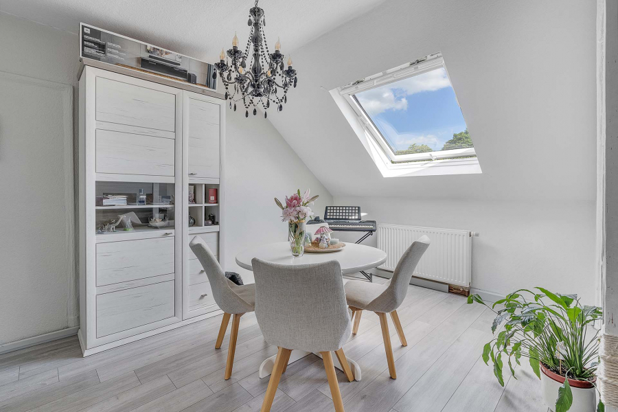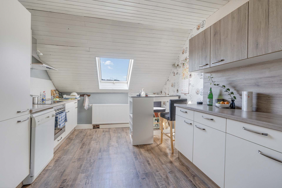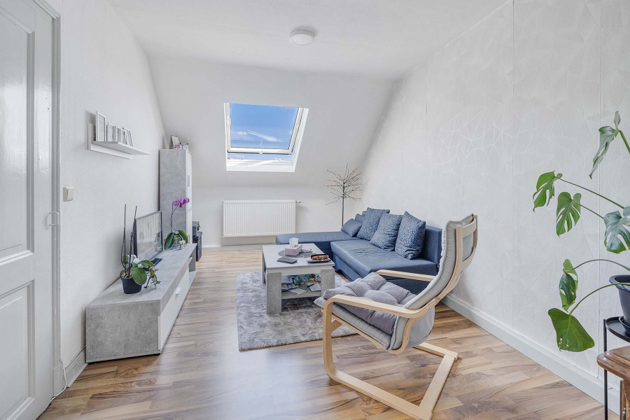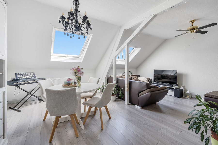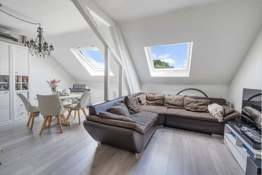 Die 62 m² große, schicke Dachgeschosswohnung beeindruckt mit ihren gemütlichen Dachschrägen und den Sichtbalken im Wohn-/Esszimmer.
