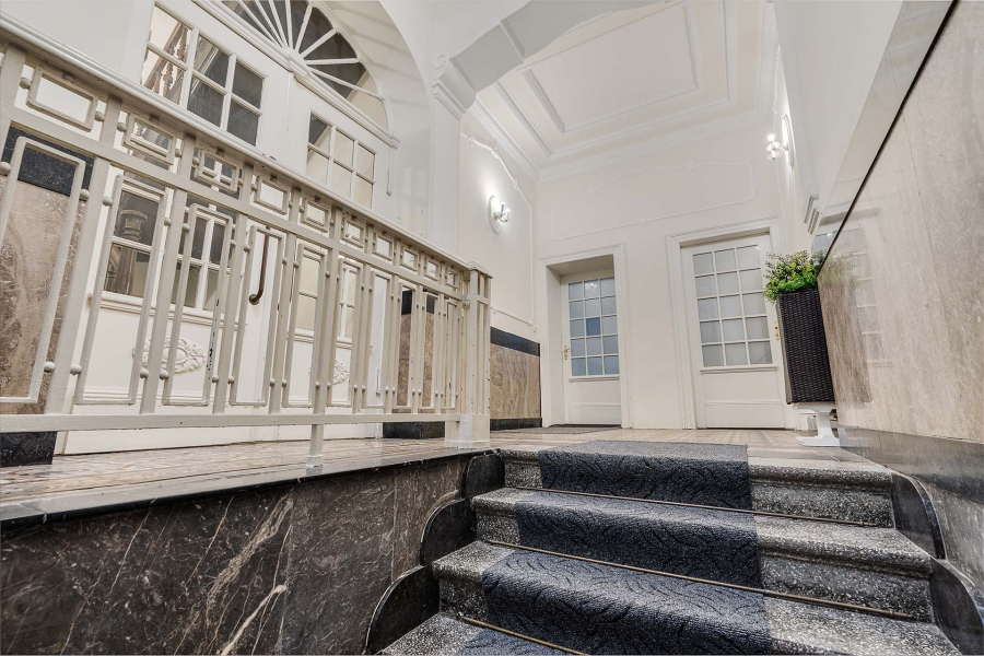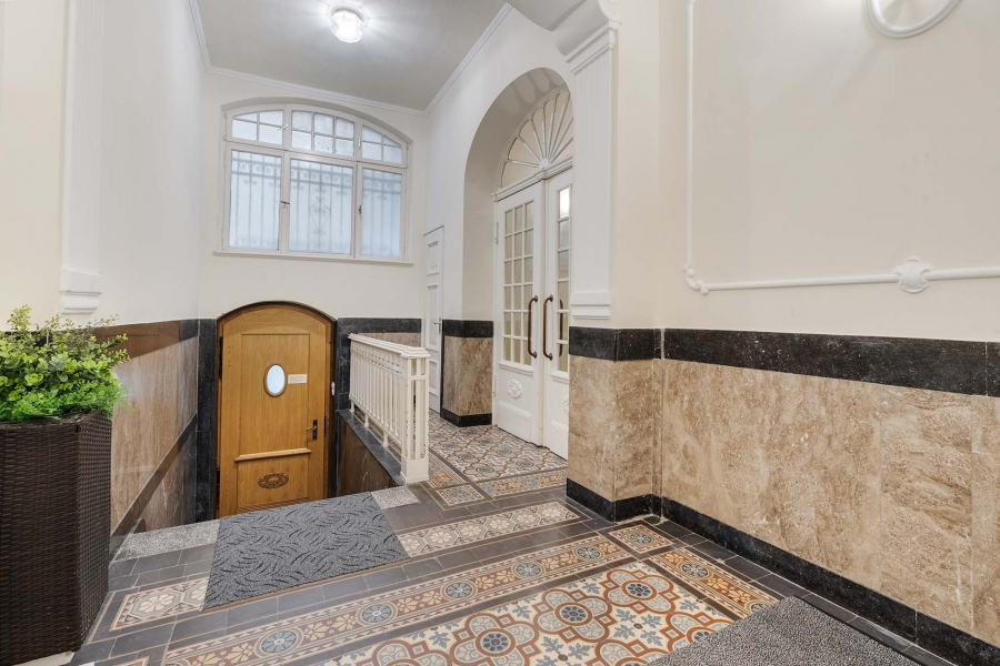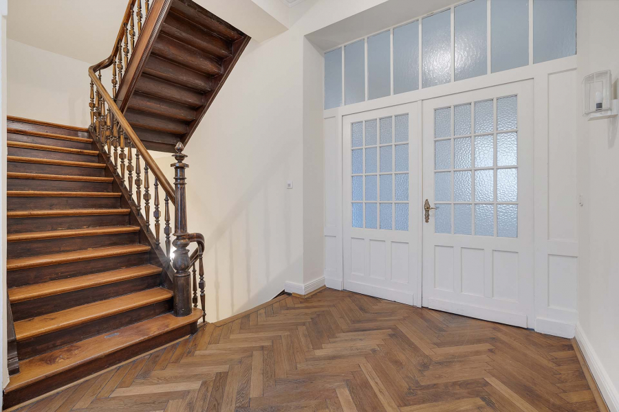 Durch ein schmiedeeisernes Eingangstor betreten Sie geschützt den seitlichen Eingang zur Villa. Viele tausende Male sind schon Eigentümer und Gäste in das gigantische mit Marmor verkleidete Foyer gekommen. Ein alter Steinfliesenboden, mit Stuck verzierte Decken und Wände und die stilvolle Tür zum Holztreppenhaus, erahnen die prunkvolle Zeit.