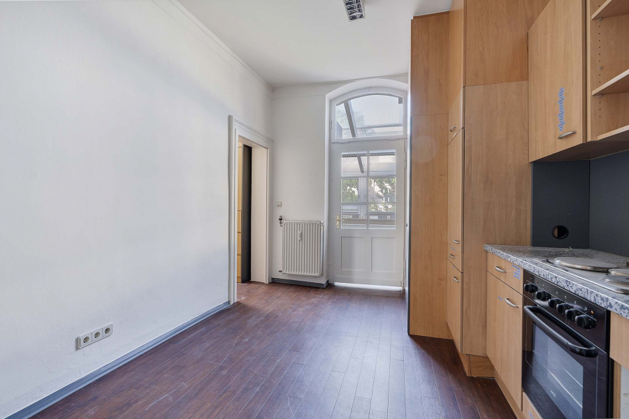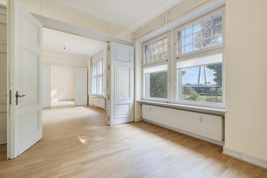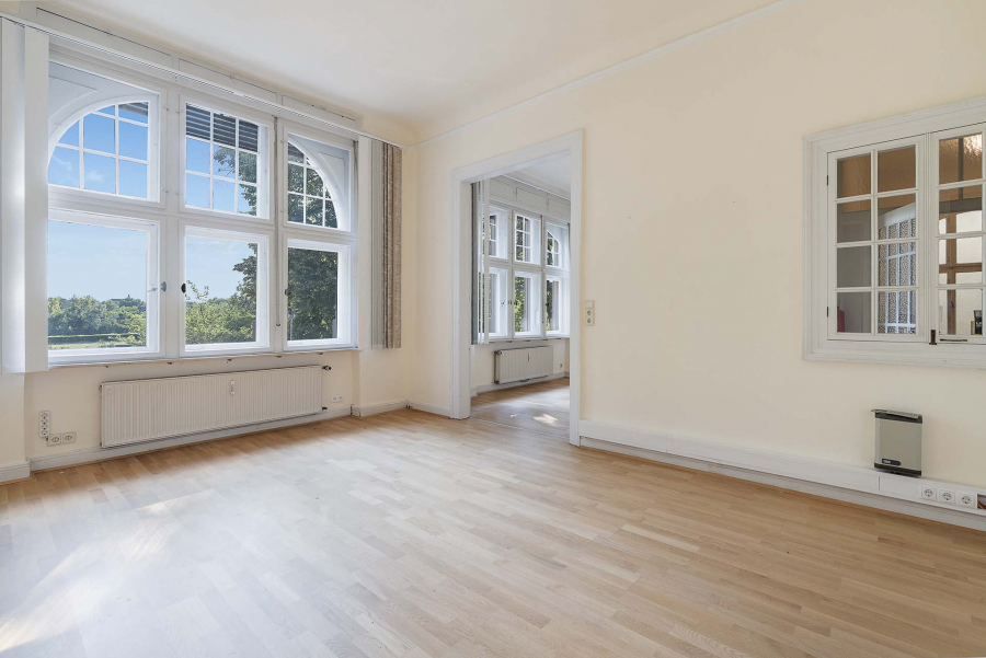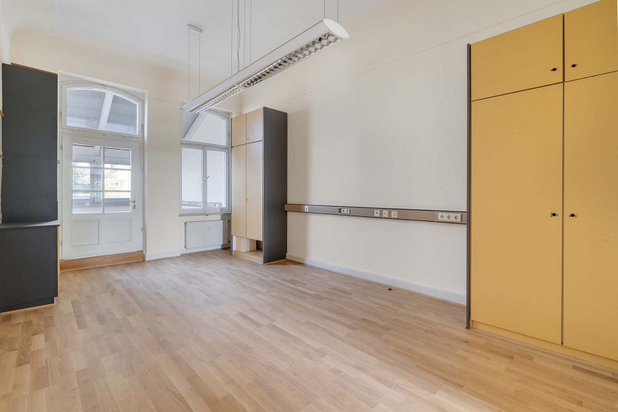 Im Obergeschoss mit ca. 190 m² war lange Zeit ein Architekturbüro. Hohe Decken, Kassettenflügeltüren, Holzfußböden... werden Sie begeistern. Ein wahrscheinlich ehemaliger Balkon wurde in die Bürofläche integriert, - aber wer weiß, was Ihr Wunsch ist? Ein repräsentatives Büro oder vielleicht die Umnutzung in Wohnraum?