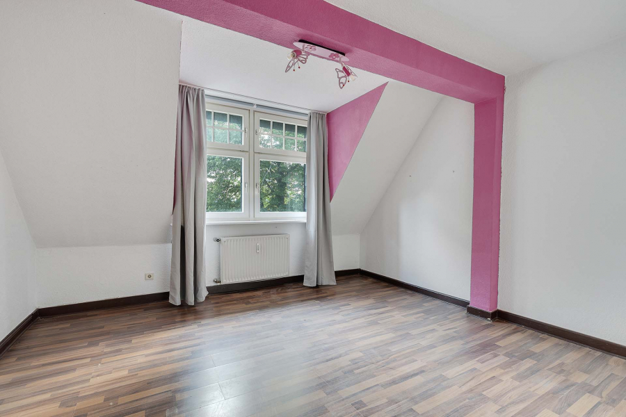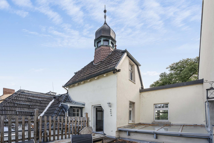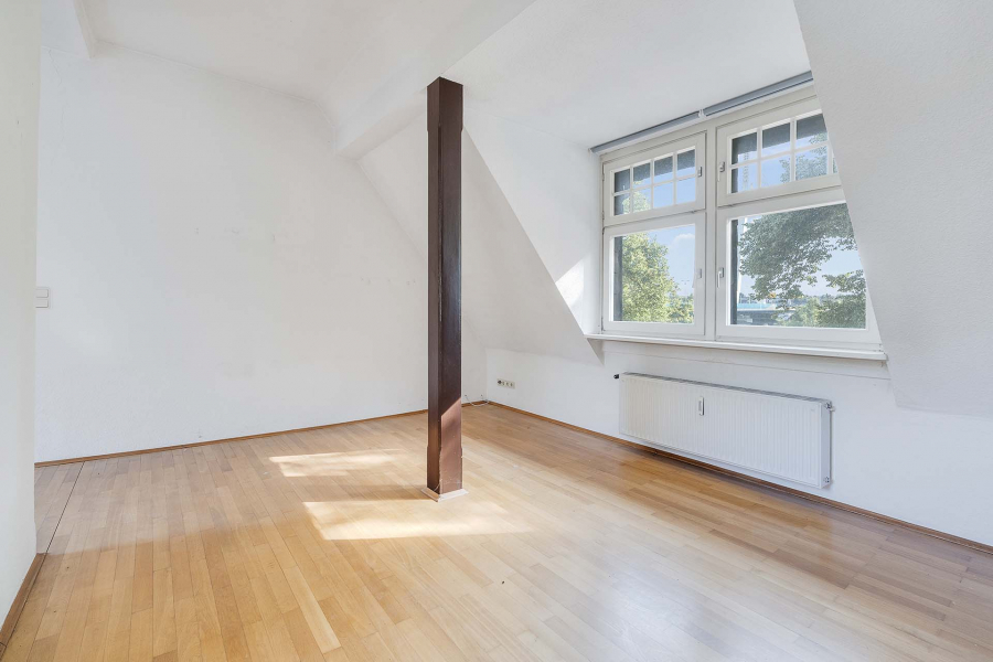 Im Dachgeschoss präsentiert sich eine schnuckelige 109 m² große Wohnung mit gemütlichen Dachschrägen und teilweise Sichtbalken. Die Wohnung wird mit einer kleinen Dachterrasse mit Blick auf das hauseigene Türmchen belohnt.
