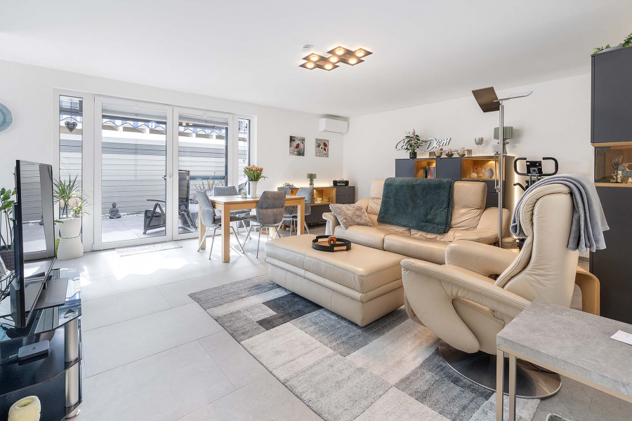 Großzügige Fensterelemente lassen das Tageslicht in den Wohnbereich und verleihen den Räumen eine freundliche Note. Der angrenzende, praktische Abstellraum sorgt für zusätzlichen Stauraum und Ordnung.