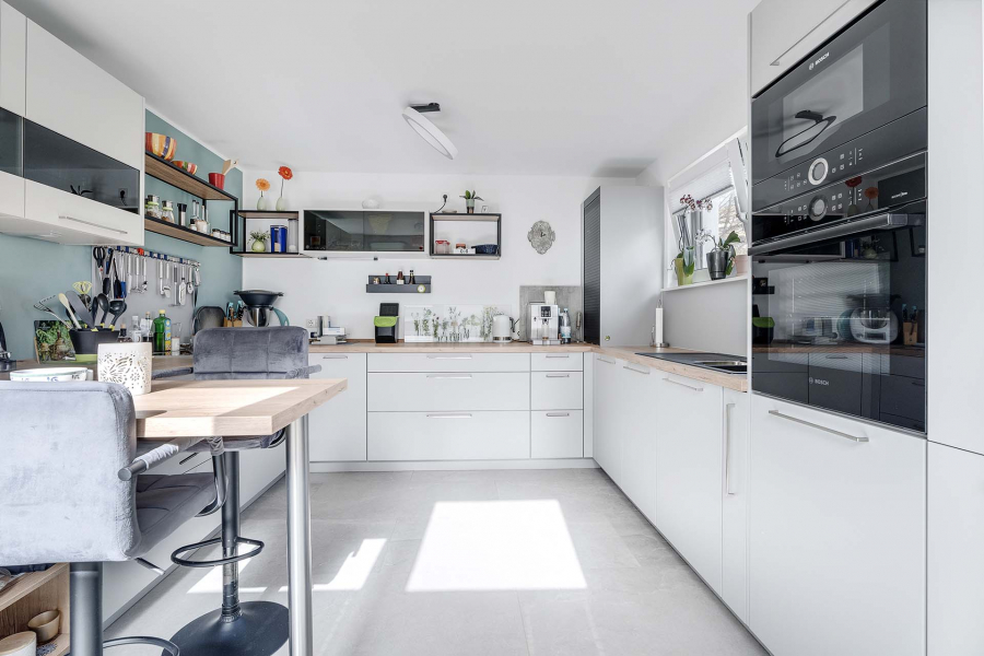 Das Herzstück ist die Raumgestaltung für Kochen, Essen und Wohnen mit bodentiefen Fenstern, die mit dem Zugang über eine Schiebeanlage mit zusätzlichem Insektenschutz zur gemütlichen Terrasse zusätzlichen Wohnkomfort und eine entspannte Atmosphäre im Freien bietet.