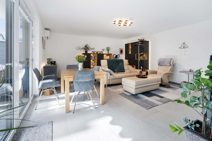 Zeitgemäßer Wohnkomfort, stufenloser Zugang, die energieeffiziente Bauweise mit durchdachter Raumaufteilung sowie die qualitätsbewusste Innenausstattung runden das stilvolle Wohnkonzept ab.