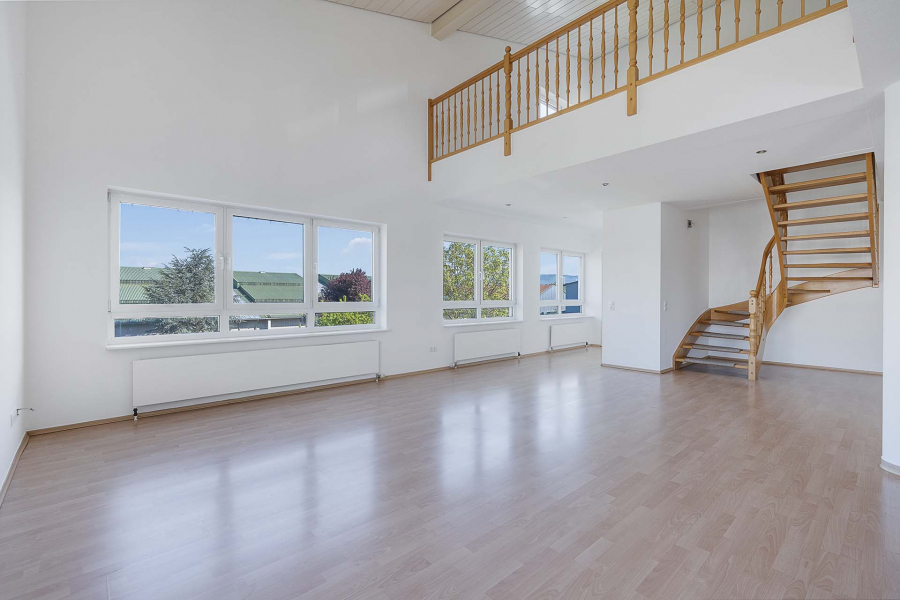 Herzstück der Wohnung ist das beeindruckende Wohnzimmer mit hohen Decken und Galerie, das ein außergewöhnliches Raumgefühl und viel Tageslicht bietet. Die offene Wohnküche fügt sich harmonisch in den Wohnbereich ein und lädt zum gemeinsamen Kochen und Verweilen ein, ideal für Familien oder Paare, die großzügiges Wohnen schätzen.